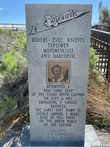His claim to fame was propelling himself skyward as rows of trucks, buses or other vehicles passed beneath him. But in order to stay relevant, each stunt had to eclipse the prior. So, when he had pretty much pushed motorcycle technology to its limits, he built a "skycycle". A water heater with wings, I kid you not. When his request to jump across the Grand Canyon was denied by grumpy, old National Park Services, he bought a piece of land bordering the Snake River in Idaho, and prepared to jump the 1/3 mile ravine. His ramp is still there and we hiked to it.